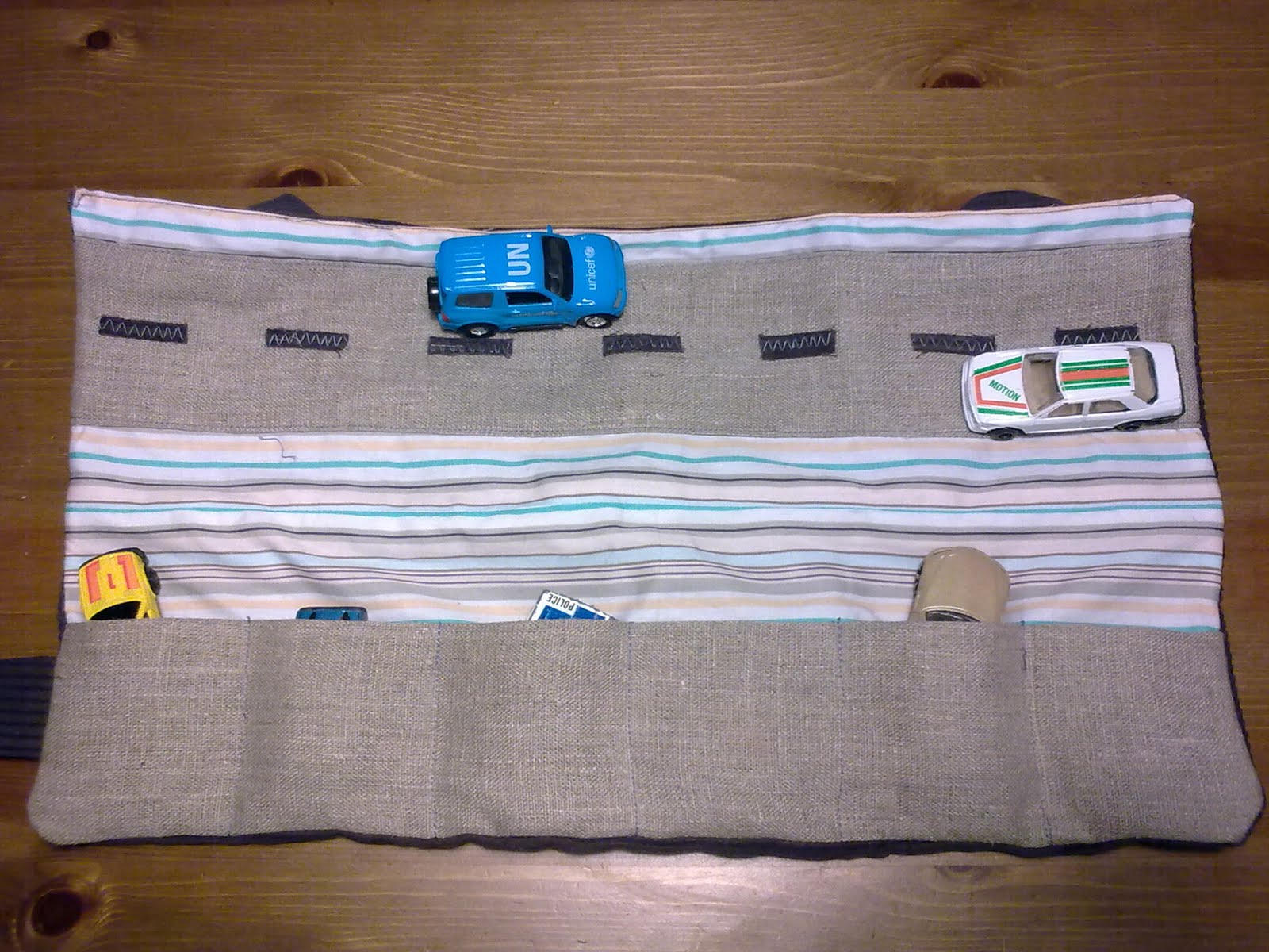Pour les roues de la voiture, j'ai utilisé des boutons et comme pour les pochettes des filles, j'ai ajouté des anses...( <=> le tissu extérieur est en deux parties)... Le scratch ? J ne suis pas fana, donc j'ai mis un bouton...![]() | Tissus Utilisés Ext : Velour marron Int : "Stripes in Vanilla" 100% coton (collection "Revive" de Patricia Bravo) Patron / Tuto |